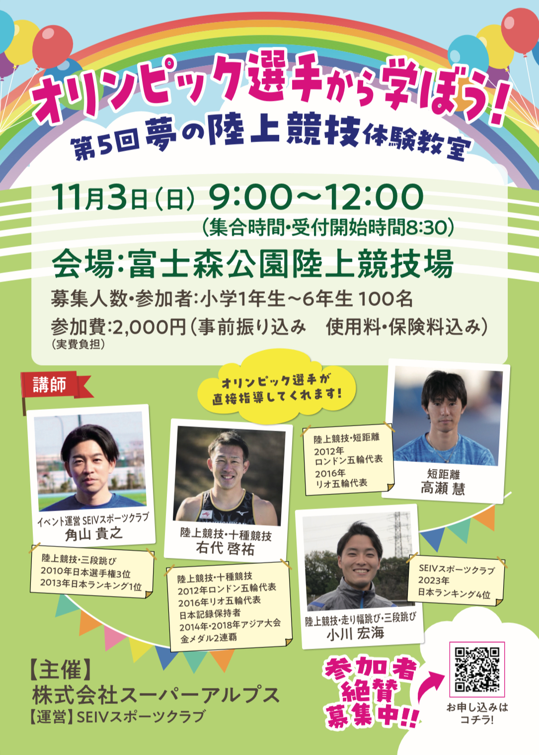 オリンピック選手から直接、走る、跳ぶ運動を学べる貴重な機会です。ぜひご参加ください!